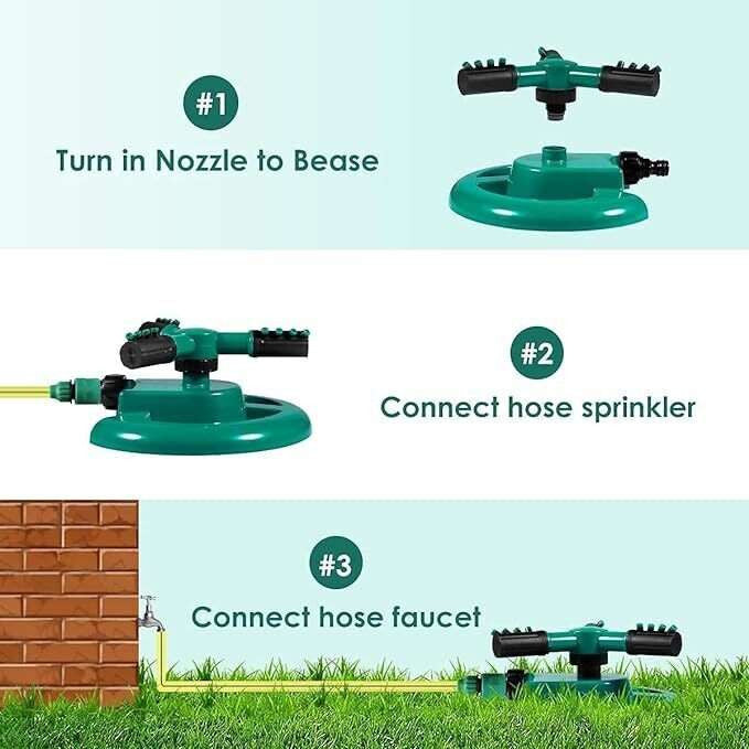 Lorsque notre arroseur à 3 bras est connecté au robinet avec un tuyau, le robinet s'ouvre et les 12 buses à angles différents de l'arroseur rotatif à trois bras pulvérisent automatiquement l'herbe et les plantes sur la pelouse.